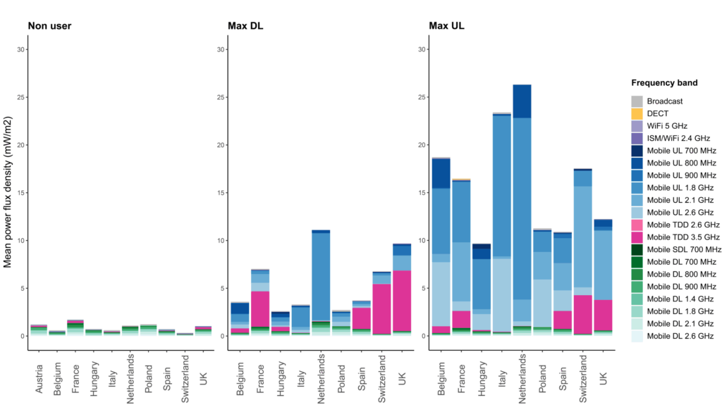 Lastly, the highest levels of exposure were registered in the maximum uplink scenario, where phones were set to upload large amounts of data and emitted about 30 cm away from the measurement device. Compared to the non-use scenario, exposure levels were between 9 and 53 times higher, depending on the country. Those with the highest mean levels of exposure were the Netherlands, Italy and Belgium.